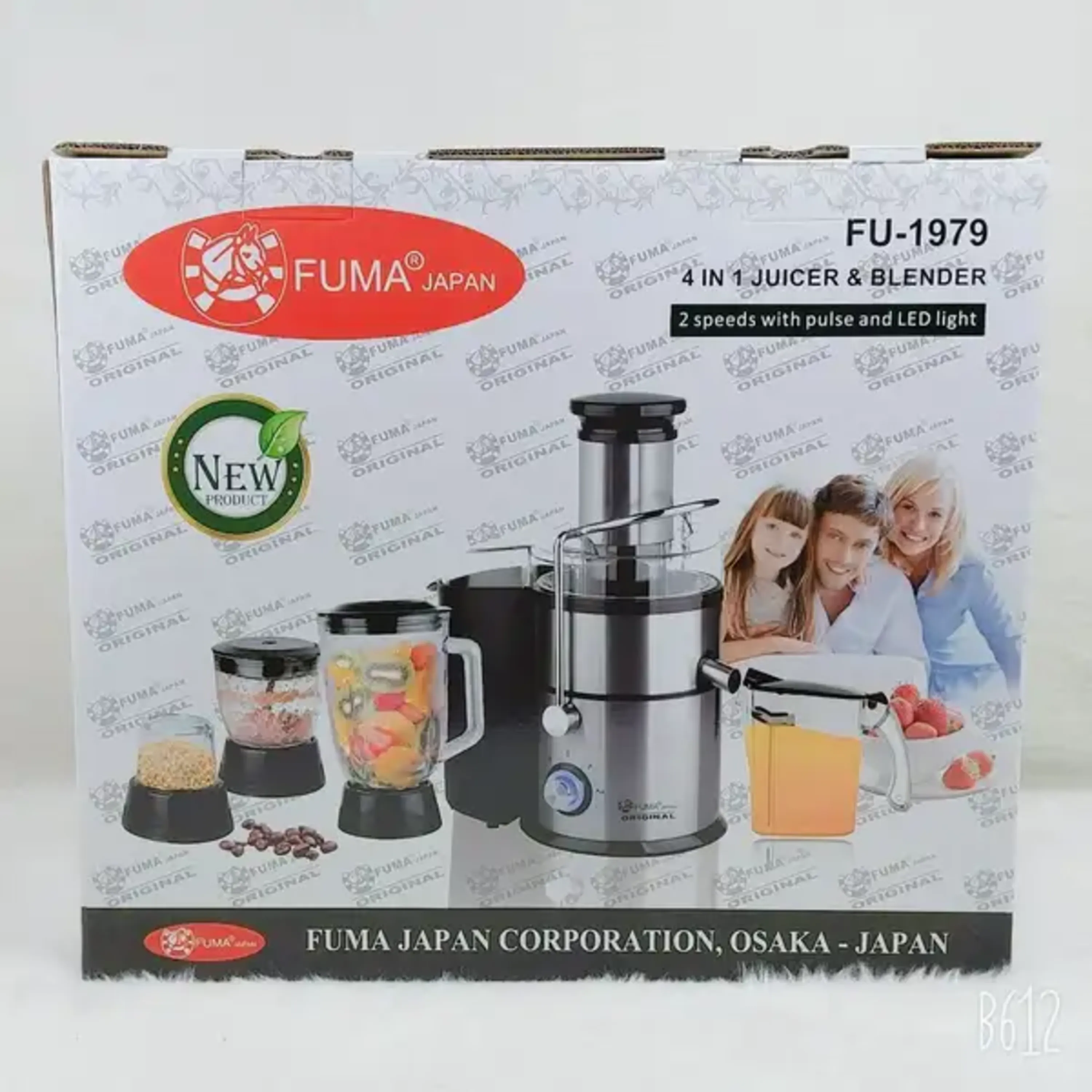 آبمیوه گیر FU-1979 یک محصول 4 کاره بوده که توسط شرکت ژاپنی فوما FUMA عرضه شده است. این محصول 4 قطعه از قابلیتهای ابمیوه گیری، خرد کردن، اسیاب کردن و مخلوط کردن برخوردار است. علاوه بر بخش اصلی ابمیوه گیر قطعات مخلوط کن، خرد کن و اسیاب کن همراه این محصول عرضه شده است. همچنین می توان توری(فیلتر) استیل برای جذب تفاله ها و ضایعات را نام برد. این توری شستشوی راحتی دارد. این محصول مواد را با هم میکس می کند، آب انواع خوراکی ها را می گیرد، همچنین مجهز به آسیاب نیمه حرفه ایی بوده که مواد را خرد می کند و امکان تهیه انواع ادویه ها را فراهم نموده است. توان این دستگاه 1200 وات بوده و سرعت آن در دو سطح قابل تنظیم است. همچنین از عملکرد پالس بهره می برد. شما می توانید بسته به نوع ماده خوراکی سرعت مناسب را انتخاب کنید. بدنه ان ترکیبی از پلاستیک و استیل ضد زنگ باداوم است. دهانه ورودی هم از استیل بوده و با قطر 75 میلیمتر می توان میوه ها را بدون نیاز به خرد کردن زیاد و در ابعاد بزرگ وارد دستگاه کرد. به این شکل هم دردسر خرد کردن کمتر می شود و هم سرعت عمل شما هنگام کار بالا می رود. مخزن تفاله بزرگ این محصول امکان گرفتن حجم بالایی از اب میوه را به کاربر می دهد بدون انکه نیازی به تخلیه مکرر باشد. این دستگاه کم صدا بوده و از پایه های ضد لغزش بهره می برد. به لطف این پایه ها می توان دستگاه را بر روی سطوح مختلف قرار داد و هنگام فعالیت عملکردی ارام و بدون لرزش از این محصول شاهد بود. این دستگاه از ایمنی بالایی برخوردار بوده و به سوئیچ ایمنی دو گانه مجهز شده است تا بالاترین سطح ایمنی را ارائه دهد. بنابراین تنها در صورتی که همه قطعات به شکلی درست در جای خود قرار گرفته باشند دستگاه فعال می شود. همچنین به سیستم محافظ موتور مجهز شده است. در صورت وارد شدن فشار بیش از حد به موتور و گرمای زیاد عملکرد دستگاه را متوقف می نماید. این امر تاثیر زیادی بر افزایش طول عمر مفید دستگاه دارد. با استفاده از این محصول می توانید انواع آبمیوه ها را گرفته و اسموتی های خوشمزه و مختلف بسازید و یا ادویه های خوش عطر تهیه کنید. تیغه های استیل ضد زنگ بسیار محکم به راحتی اب انواع میوه ها و سبزیجات را می گیرد. در پایان کار می توانید قطعات را درون ماشین ظرفشویی انداخته تا بدون دردسر تمیز شوند.