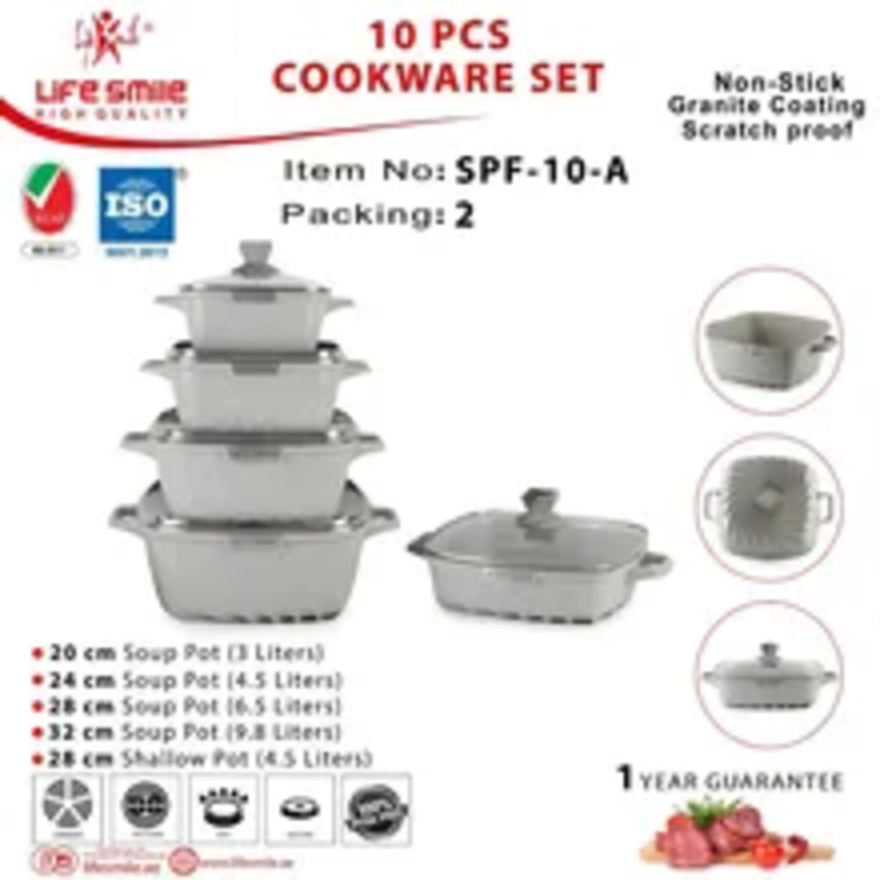 سرویس قابلمه 10 پارچه لایف اسمایل مدل FLCM10 از محصولات باکیفیت و زیبای برند معتبر Life Smile میباشد. این سرویس از چهار عدد قابلمه دربدار در سایزهای 20، 24، 28 و 32 سانتیمتر و یک عدد تابه دربدار در سایز 28 سانتیمتر تشکیل شده است. ساختار بدنه سرویس از آلومینیوم ریختهگری شده با روکش گرانیتی بوده و دارای پایه القایی میباشد. استفاده از جنس آلومینیوم در ساخت این محصول موجب انتقال بهتر و توزیع یکنواخت حرارت در هنگام پخت غذا میشود. سرویس قابلمه لایف اسمایل هیچگونه گاز مضر PFOA را تولید نخواهد کرد و همچنین دارای سطوح نچسب بوده که غذا به آن نخواهد چسبید.