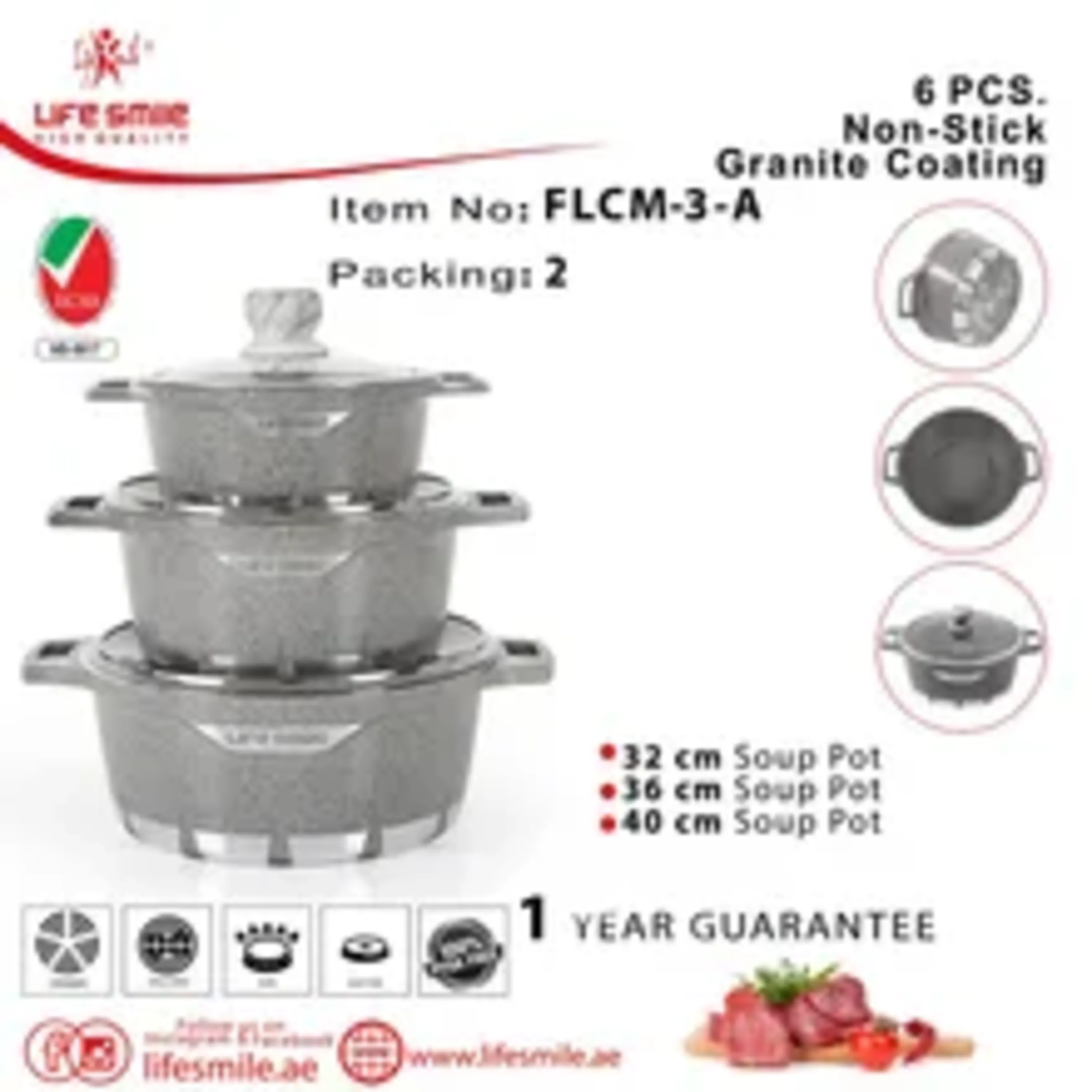 سرویس قابلمه گرانیتی لایف اسمایل مدل FLCM-6 از محصولات زیبا و با کیفیت برند LIFESMILE می باشد. بدنه قابلمه ها از جنس آلومینیوم تولید گردیده که به دوام، استحکام و ماندگاری بیشتر آن ها کمک می کند. این مدل قابلمه دارای پوشش گرانیتی بوده که ترکیبی از تفلون و سرامیک می باشد که مقاومت سطح داخلی آن را در برابر خراشیدگی بالا می برد. سطح صاف و نچسبی را در قسمت داخلی قابلمه ایجاد می کند تا افراد به راحتی بتوانند مواد را بعد از پخت از قابلمه خارج نمایند.ین مدل سرویس قابلمه لایف اسمایل مدل FLCM-6 دارای سه سایز 32 -36-40، است که برای پخت انواع غذا ها مناسب می باشد. همچنین در سه رنگ آبی، قرمز و خاکستری در بازار موجود است. با توجه به سطح نچسب و اندازه ی مناسبی که دارند به راحتی قابل تمیز شدن هستند و افراد می توانند به آسانی آنها را شستشو دهند.