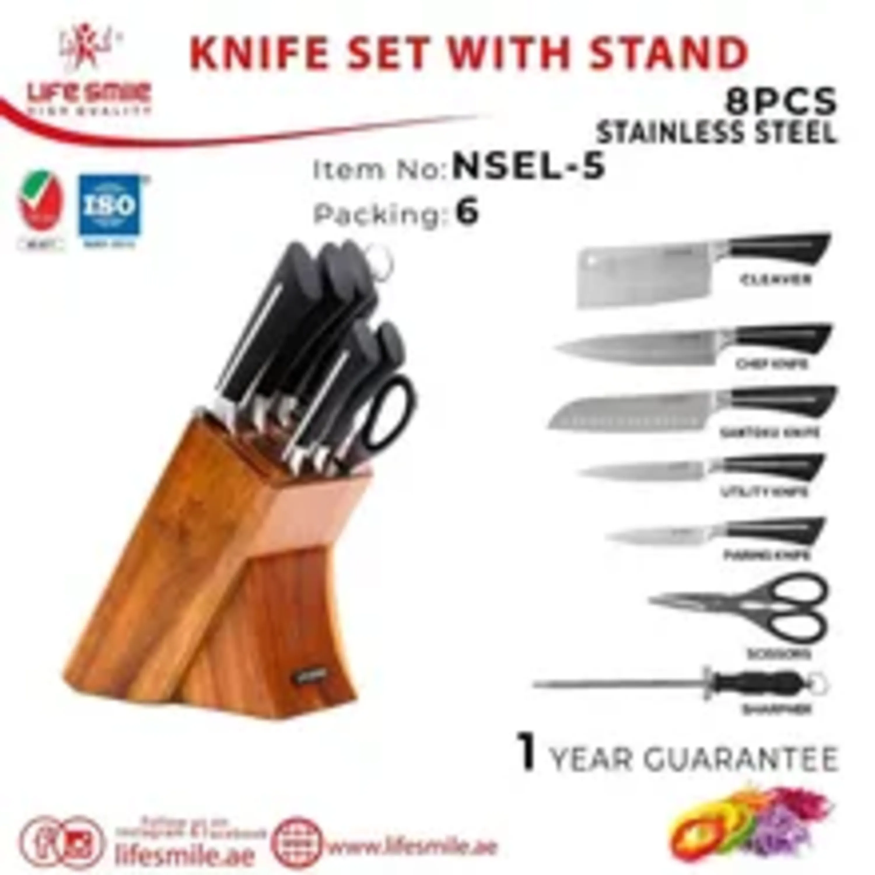سرویس چاقو آشپزخانه لایف اسمایل مدل NSEL-5 یکی دیگر از محصولا با کیفیت و زیبای برند life Smile میباشد. ست چاقو لایف اسمایل از 8 پارچه مختلف شامل چاقو خردکن، چاقو سرآشپز، چاقو نان، ابزار چاقو، چاقو تکهای، شارپنر، قیچی و محفظه نگهداری چوبی تشکیل شده است.