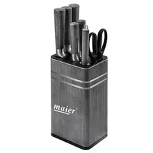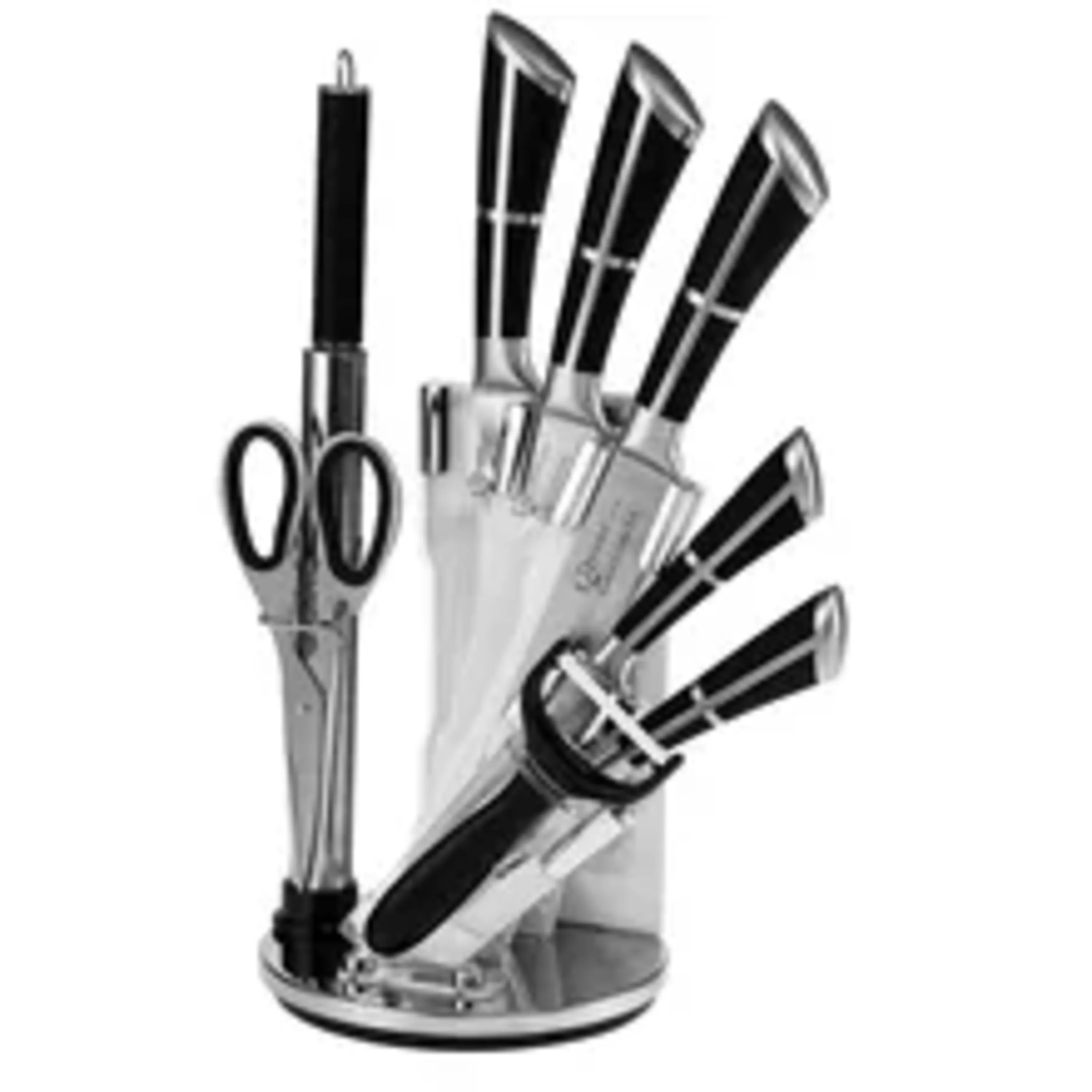 ست چاقوی 9 پارچه شامل: - یک پایه گردان از جنس پلاستیک به ارتفاع 15.5 و قطر 35.5 سانتیمتر - ابعاد قیچی: 18.5 × 7 سانتیمتر - ابعاد چاقو تیزکن: طول کلی 29.5 و طول تیغه 18.5سانتیمتر - ابعاد ساطور: طول کلی 29.5 ، طول تیغه 17 و عرض تیغه 7.5 سانتیمتر - چاقو برش سایز 1: طول کلی 34، طول تیغه 20 و عرض تیغه 4 سانتیمتر - چاقو برش سایز 2: طول کلی 34، طول تیغه 20 و عرض تیغه 2.5 سانتیمتر - چاقو برش سایز 3: طول کلی 23.5، طول تیغه 11 و عرض تیغه 2.2 سانتیمتر - چاقو برش سایز 4: طول کلی 20.5، طول تیغه 8.7 و عرض تیغه 2 سانتیمتر - یک عدد پوستکن پلاستیکی