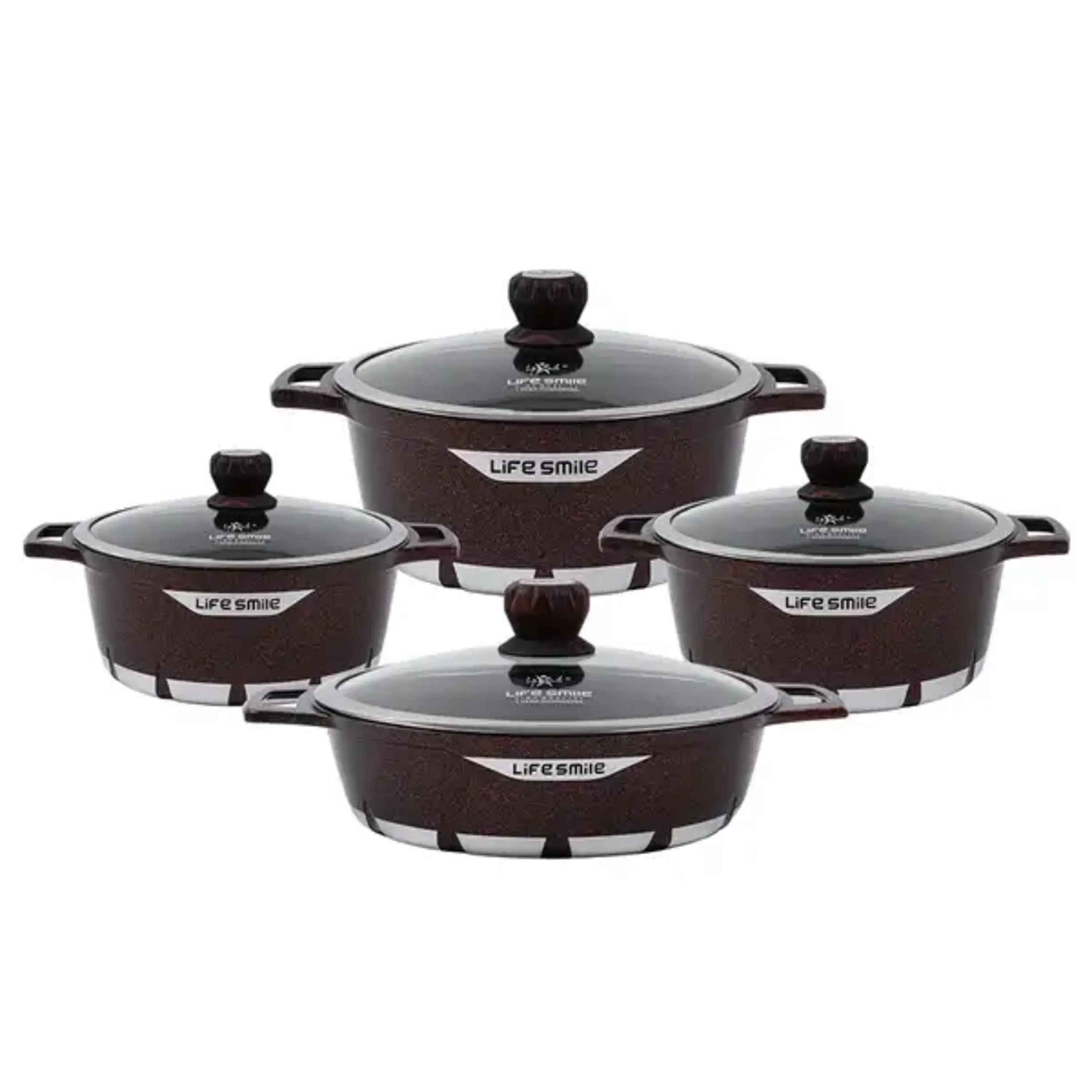 سرویس قابلمه گرانیت لایف اسمایل مدل FLCM8-Bدارای سه عدد قابلمه گرانیت در اندازه های 20 - 24 - 28 و تابه در اندازه 28 با درب شیشه ای بسیار بادوام و دسته های نسوز (دسته های قابلمه از جنس خود بدنه یعنی گرانیت ) می باشند این سرویس قابلمه کیفیت ساخت بسیار بسیار بالایی دارد . کفه بیرونی قابلمه طوری طراحی شده است که گرما را بسیار سریع جذب خود کرده و در نتیجه قابلمه سریعتر از سایر قابلمه ها داغ خواهد شد و مزیت دیگر آن این است که طراحی فوق العاده کف بیرونی آن باعث می شود قابلمه مدتی تمام داغ بماند و در نتیجه غذای شما بعد از خاموش کردن شعله گاز مدتی داغ بماند . درب شیشه ای و شفاف از جنس پیرکس باعث می شود در هنگام پخت غذا براحتی محتویات قابلمه را مشاهده و مراحل پخت غذا را مشاهده کرد. پیرکس در مقابل حرارت بسیار مقاوم است . شستشوی بسیار راحت و تنها با یک ابر از مزایای ظروف گرانیتی است که استفاده از آن را بیش از پیش راحت کرده است.
