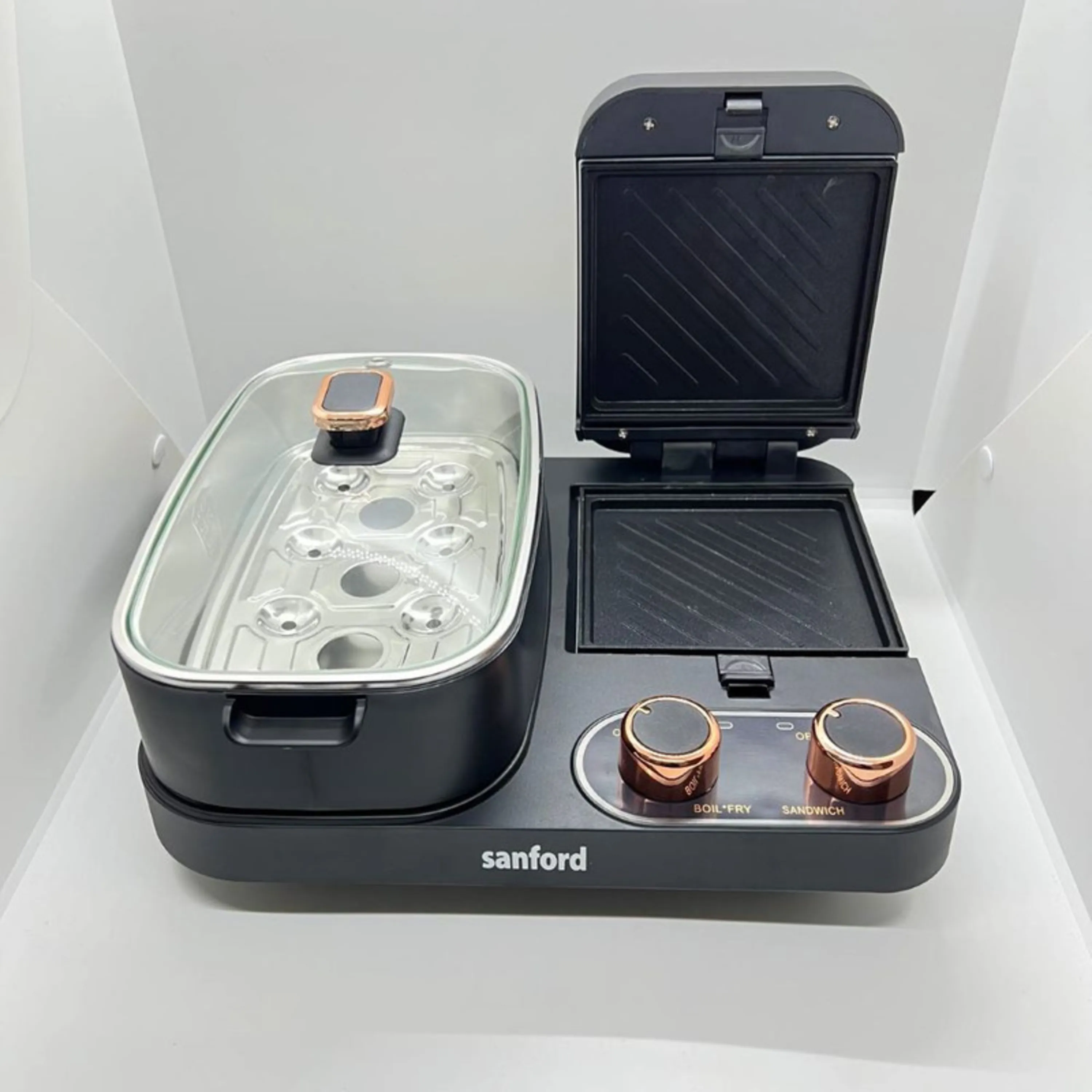 صبحانه ساز پنج کاره سانفورد یک دستگاه چند منظوره است که با توان کلی 1300 وات تمام نیازهای شما را جهت تهیه یک صبحانه کامل و دلچسب مهیا مینماید. نکته خوب دستگاه این است که تمامی اجزای ان قابل جدا شدن هستند و به راحتی در انوع ماشین ظرفشویی قرار میگیرد . در بخش ساندویچ ساز ان یک صحفه 117x127 میلی متری با قدرت 600 وات برای شما تعبیه شده . همچنین شما یک ماهیتابه نسوز درارید که هم در قسمت زیرین سوپ ساز و بخار پز و تخم مرغ اب پز کن و هم در قسمت بالای ان قابل استفاده هست در کل کارایی این ماهیتابه نسوز سرخ کردن بدون روغن مواد غذایی و جهت تهیه نیمرو ، سرخ کردن بیکن، سوسیس و ... و است با استفاده از دکمه های تعبیه شده میتوانید از هر بخشی که خواستید استفاده کنید در قسمت دیگر از محفظه بخارپز آن برای بخارپز نمودن تخم مرغ، تهیه فرنی و ... استفاده نمود. و همچنین دارای یک قطعه فلزی برای اب پز کردن تخم مرغ است که تا 8 عدد تخم مرغ را فقط با ریختن اب در محفظه سوپ ساز و قرار دادن ان قطعه به راحتی میتوان تخم مرغ را اب پز کنید محفظه سوپ ساز این دستگاه یک لیتر و با توان 500 وات است که با ان میتوان شیر را هم گرم کرد