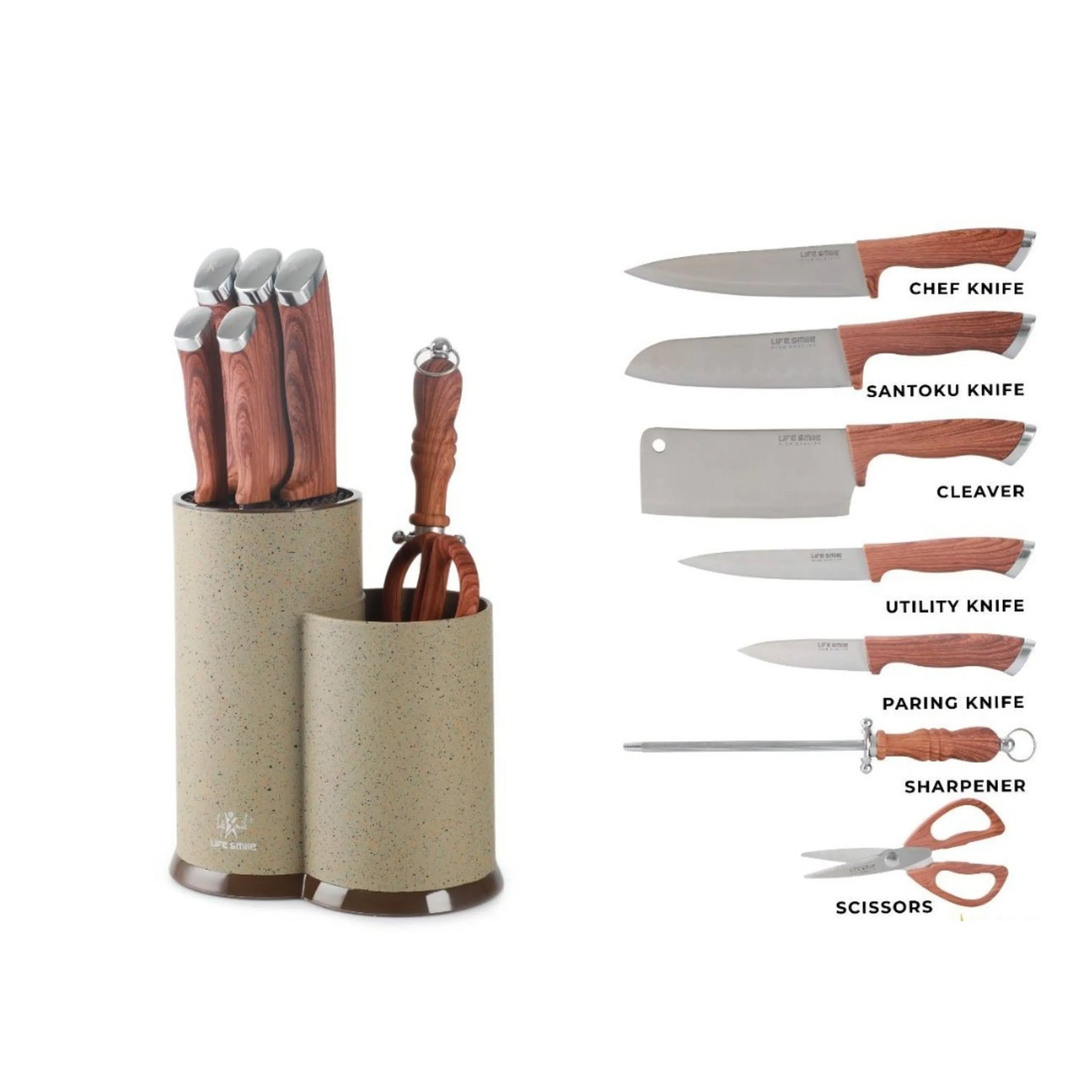 چاقوی سرآشپز، ساطور، چاقوی همه کاره، چاقوی پوست کندن، چاقوی خرد کردن، قیچی، تیز کننده، پایه نگهدارنده