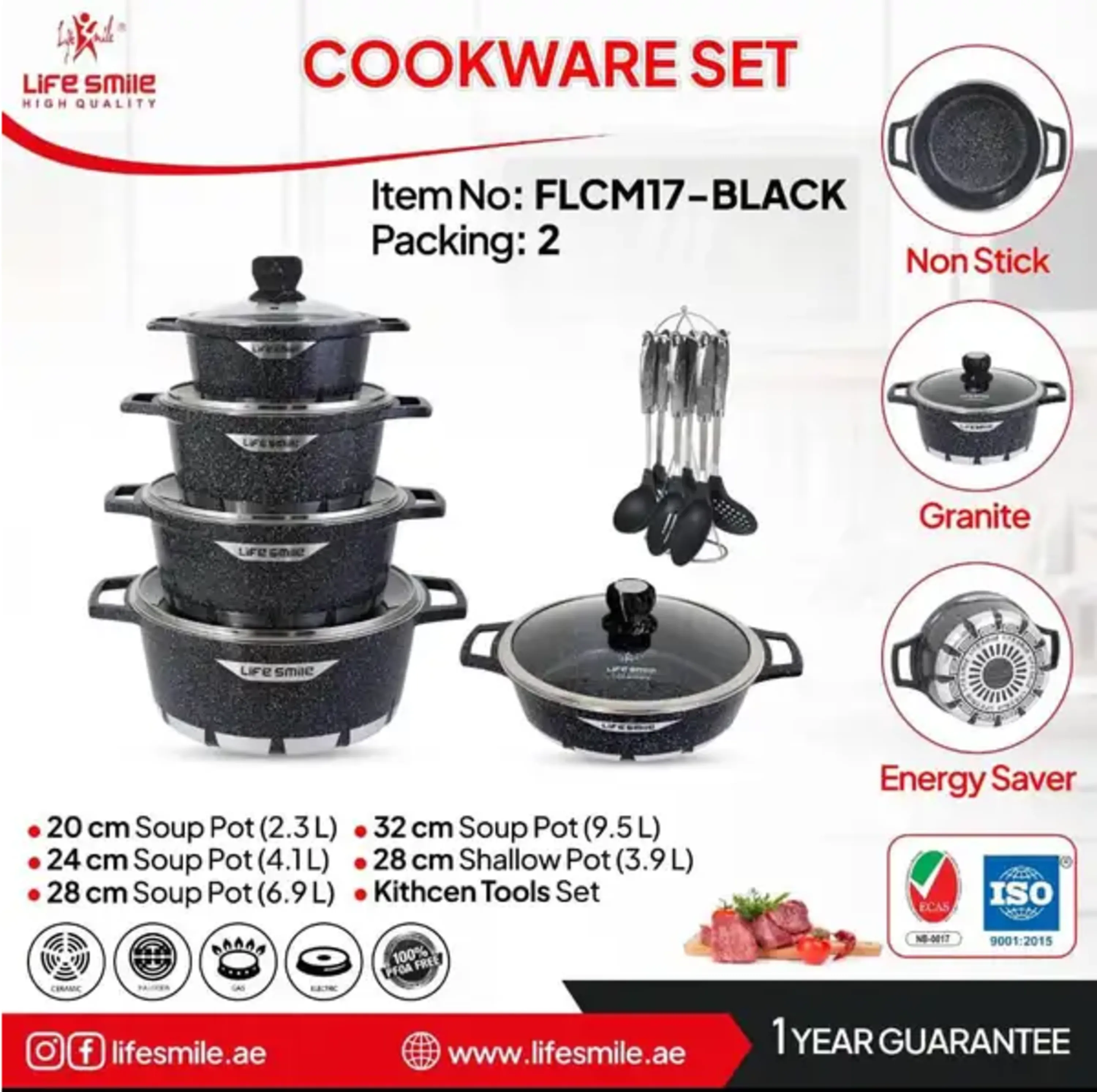 دستگیرههای سرویس گرانیتی LIFE SMILE FLCM17 از باکالیت بوده که این جنس در مقابل حرارتهای بالا مقاوم و نسوز خواهد بود. جنس دربها از شیشه بوده که بر روی آن منافذ بخار تعبیه گردیده است. قابلمه های این سرویس قابلیت استفاده بر روی انواع اجاق گاز را دارد و همچنین میتوانید آن را در داخل فر نیز قرار دهید. سرویس قابلمه 17 پارچه مدل FLCM17 لایف اسمایل در سه رنگ زیبای مشکی، زرشکی (یا عنابی) و خاکستری (یا طوسی) تولید و روانه بازار گردیده است.