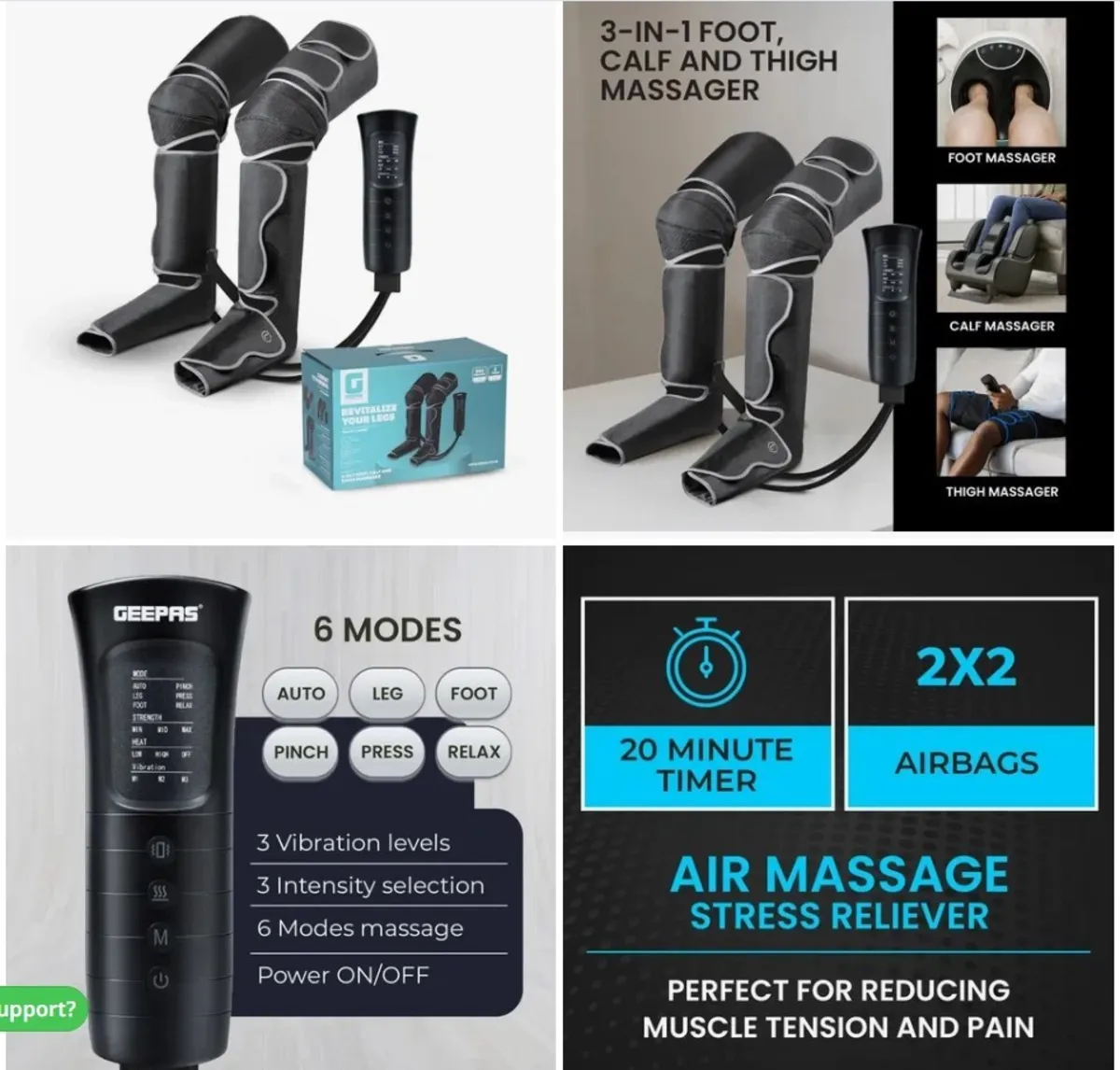 دارای پوشش قسمت زانو و دارای ویبره که در مدل های دیگر این آپشن وجود ندارد- : بهبود گردش خون-جلوگیری از لخته شدن خون-کمک به سرعت جریان خون-کمک به شل شدن عضله های گرفته شده- اکسیژن رسانی به بافت ها را افزایش می دهد- رفع درد و خستگی مزمن-مناسب برای سردی اندام ها- دارای 6 مود متفاوت- دارای 3 درجه گرما- دارای 3درجه ویبره